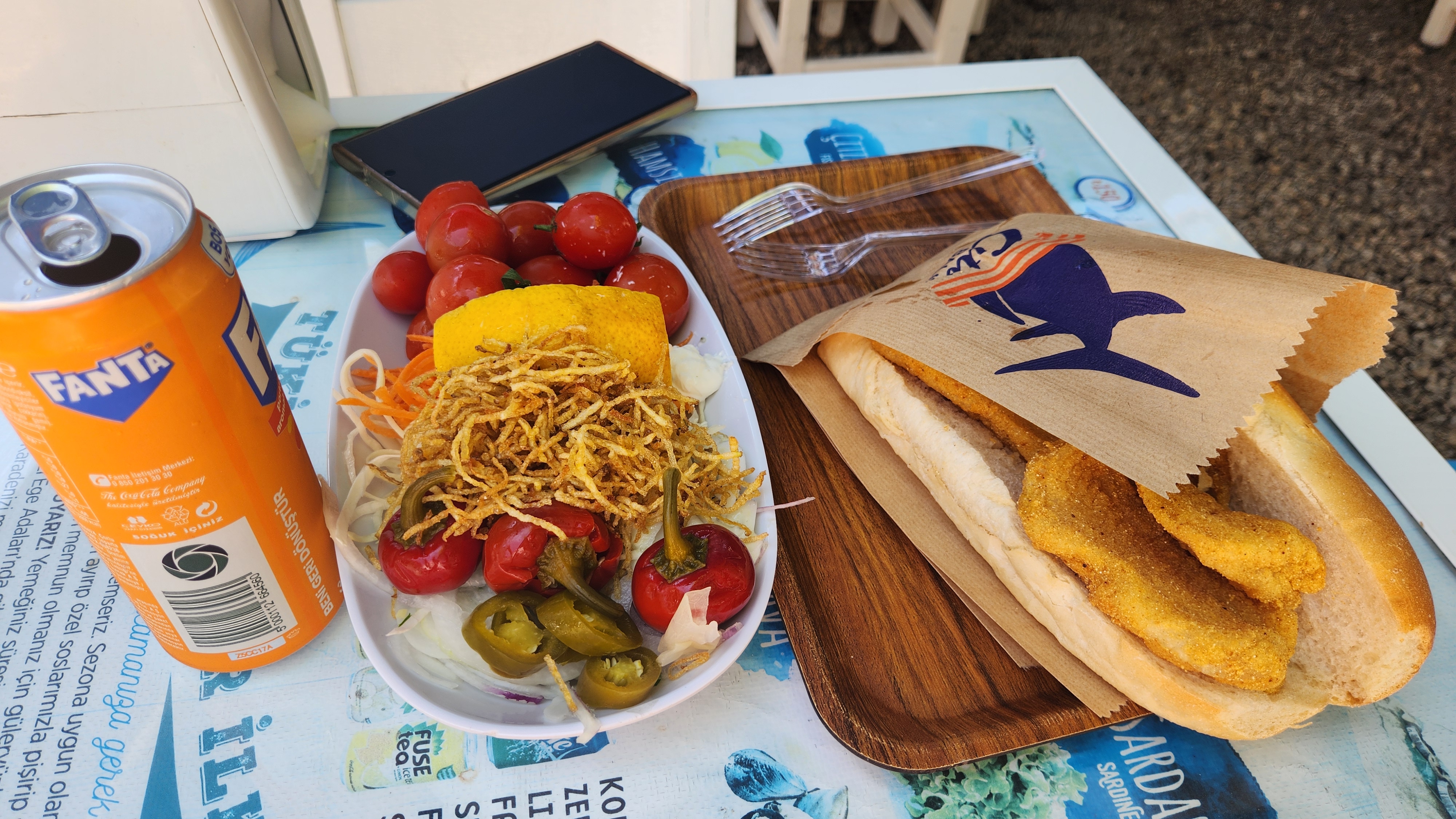 점심에 갔을 때는 오픈 하자마자 간 덕분에 바로 앉아서 먹을 수 있었습니다. 대구케밥 1개와 환타를 먹은 것 같습니다.(총 245리라)