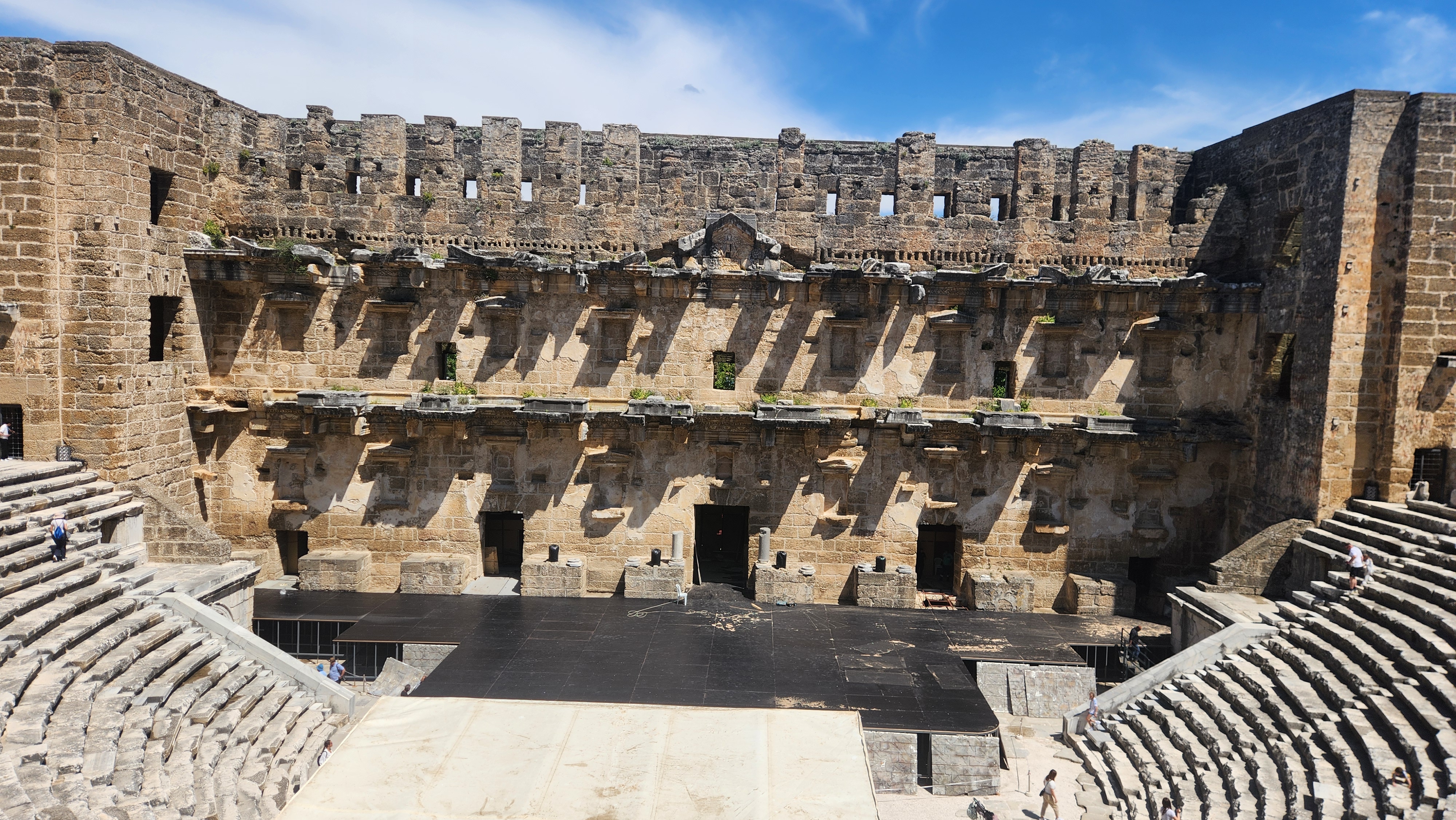 특히 약 15,000명 이상을 수용할 수 있는 거대한 규모의 고대 극장은 강당과 무대를 조화롭게 결합한 로마 시대의 훌륭한 작품이다. 테오도로스의 아들 건축가 제노가 지은 건축물로, 로마 황제 마르쿠스 아우렐리우스의 통치 기간 동안 2세기에 지어진 가장 큰 극장 중 하나다. 로마 시대에 야외 공연에 사용되던 곳이며, 로마 시대의 문화유산 중 지금도 잘 보존되어 있다. 매년 아스펜도스 오페라 페스티벌이 이곳에서 열리기도 한다.